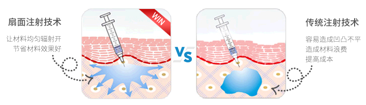让注射材料呈扇形辐射开被充分利用,避免产生凹凸痕迹,节省注射剂量30%以上。
